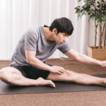 ③足を広げて座り、片方の足を曲げもう一方の足を伸ばします。